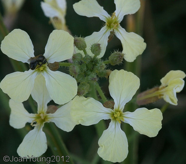 This is the third plant known as Wild Mustard (Raphanus raphanistrum). One has pink flowers and very different from the other two. These are distinguished in that one has a very hairy stem. Please search this blog for the name to see the others.